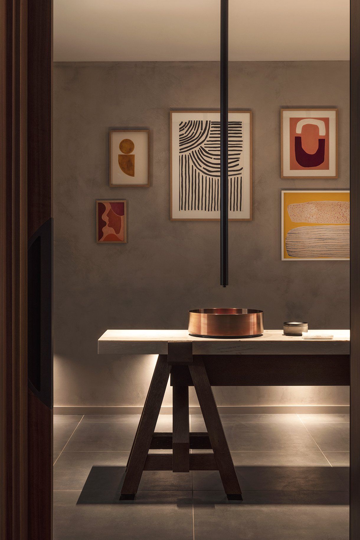 Dans le lobby, le desk d’accueil est habillé d’un drapé de cuivre.