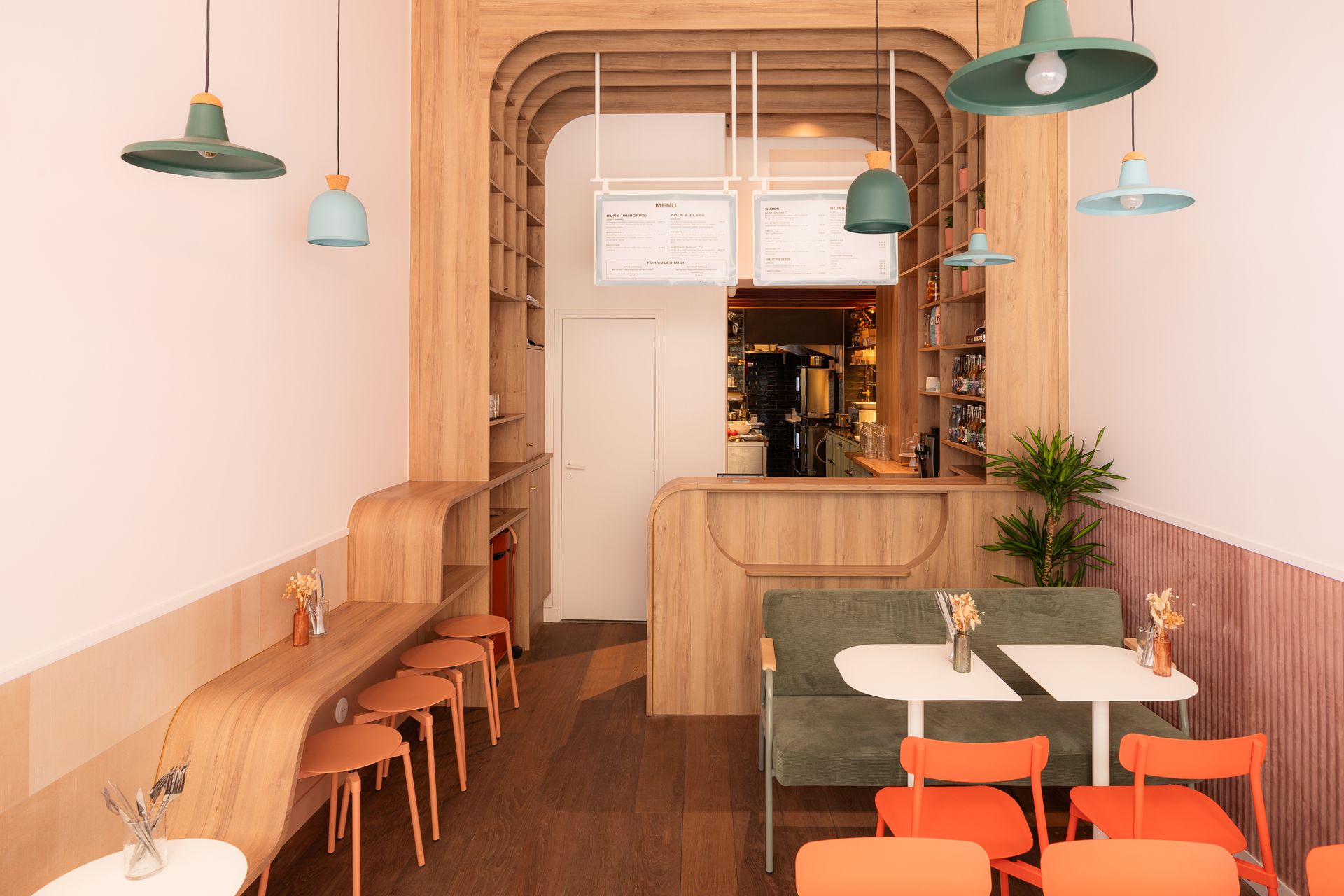 La composition conjugue formes organiques et palette de tons pastels, où le mobilier aux lignes douces et les suspensions colorées créent une atmosphère apaisante et épurée dans cet établissement distingué "Découverte Fooding 2025".